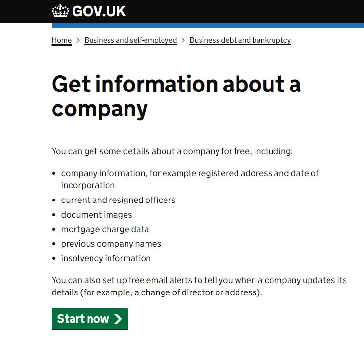 Click on ‘Find company information’, and click on ‘start now’ and type in any company name you want to have a look at. A list of company names will most likely come up, just click on the one you want to see