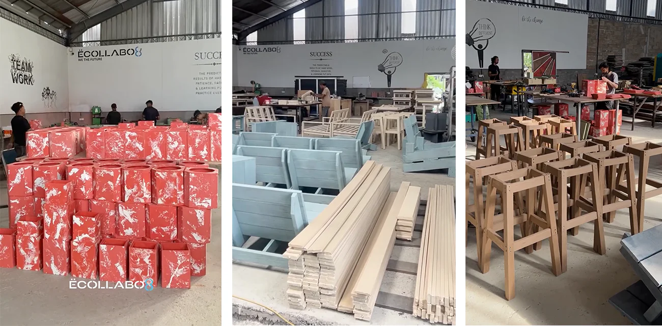 In just a few years, ECOLLABO8 has scaled up significantly. Their factory has reached peaks of around 5,700 kg of plastic processed in a single day, with a maximum production capacity of up to 9 tons per day.